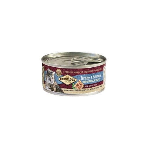 Teljes értékű, gabonamentes és burgonyamentes konzerv eledel minden fajtájú felnőtt macska számára pulykával és lazaccal.