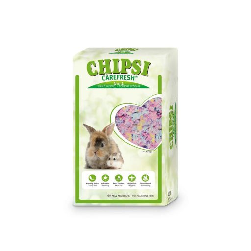 A CHIPSI Carefresh Confetti színes és szupertrendi - természetes cellulóz szálakból készült alom, mely kényelmes és meleg, játékra csábít és teljesen természetes.