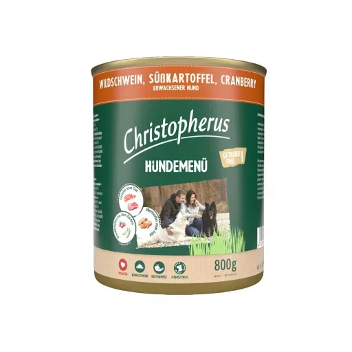 Összetevők: 62% hús és belsőségek (42% marhahús, 20% vaddisznó), 25,8% húsleves, 4% édesburgonya, 4% áfonya, 2% borsókeményítő, 1% lignocellulóz, 1% ásványi anyagok, 0,2% lenolaj