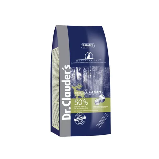 Összetevők: burgonyaliszt 47%, szárított szarvashús fehérje 15%, burgonyafehérje, répapép (csökkentett cukor), őz 5%, baromfi zsír, lenmag, monokalcium-foszfát, burgonyakeményítő, halolaj, Dr.Clauder 's Pro Digest 5 Complex 0,75% (élesztő, papayapor, ananászpor, áfonyapor, élesztő béta-glükán, inulin (FOS), spirulinapor, kenderliszt), cikóriapor 0,73%, élesztő, (dehidratált, 0,05%) glükánok), kalcium-karbonát, nátrium-klorid, pórsáfrányolaj.