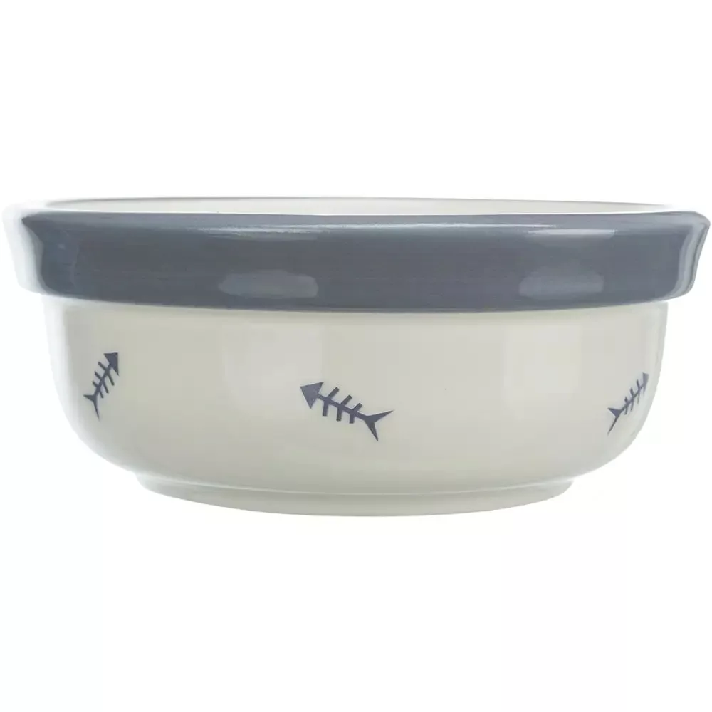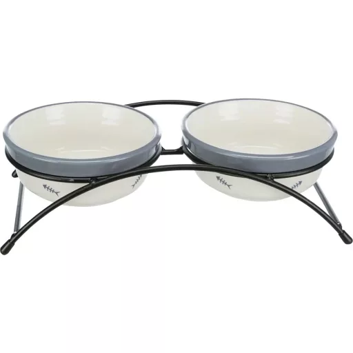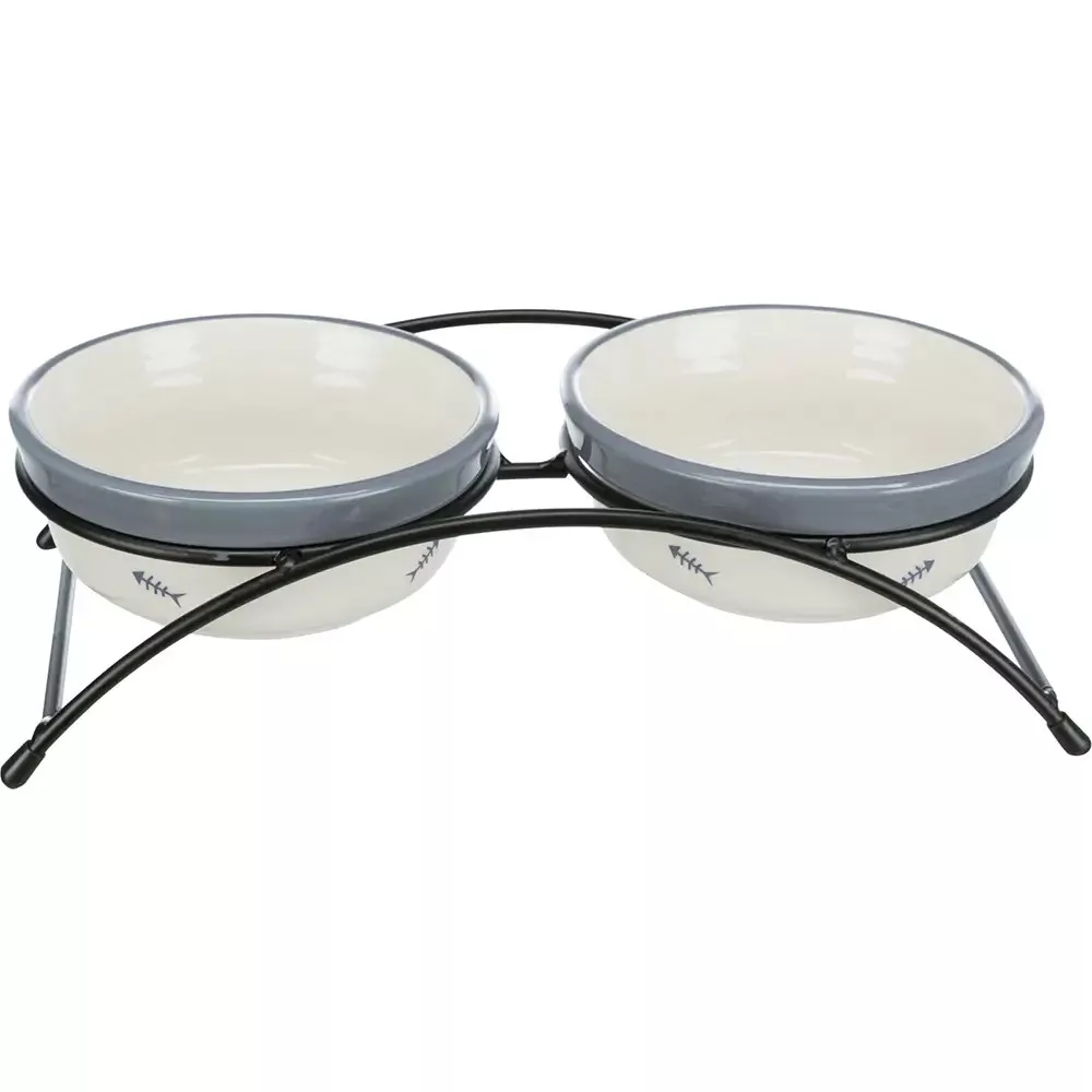 TRIXIE Eat on Feet kerámia tál szett macskának krém színű tálak szürke peremmel és szürke halcsontokkal.