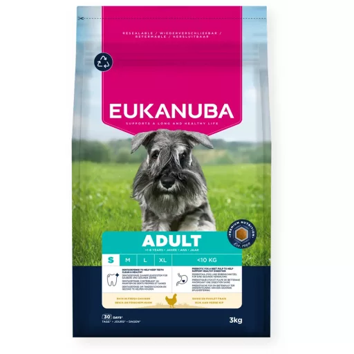 A Eukanuba Adult Small Breed teljes értékű, kiegyensúlyozott száraztáp felnőtt (1-7 év), kistestű (10 kg alatt) kutyáknak az erős izomtömeg fenntartásáért.