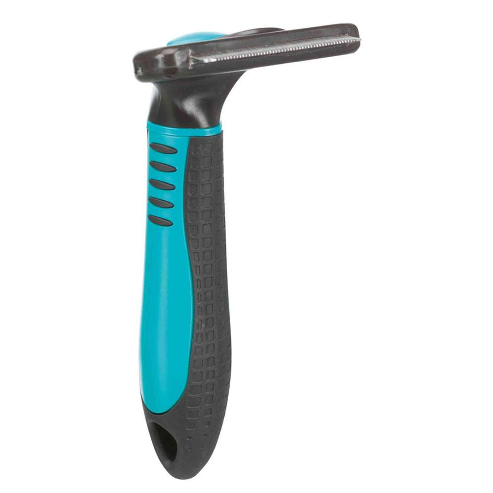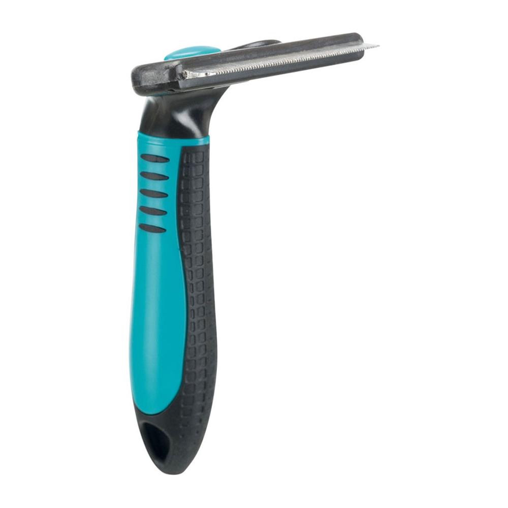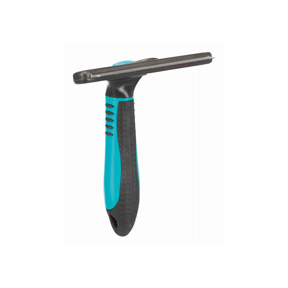 Praktikus fésű az aljszőrzet eltávolítására. Rozsdamentes acél pengével, műanyag nyéllel és csúszásmentes gumi markolattal.