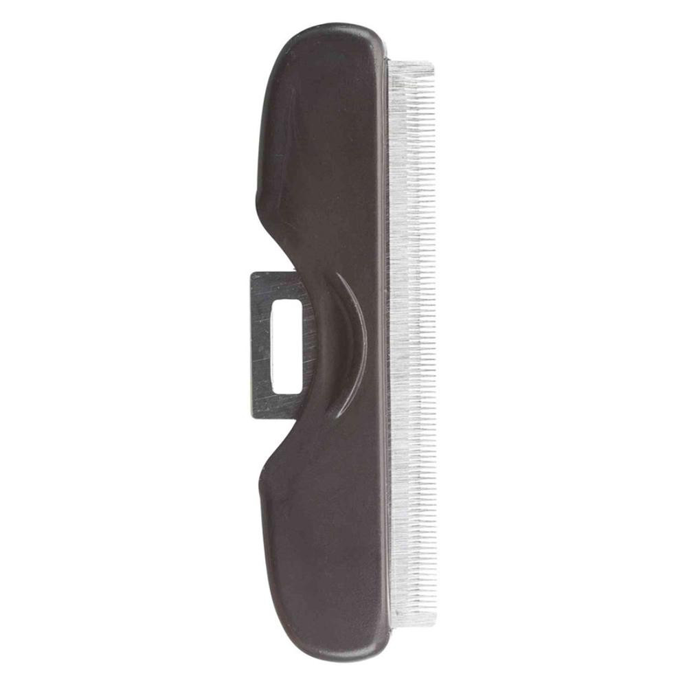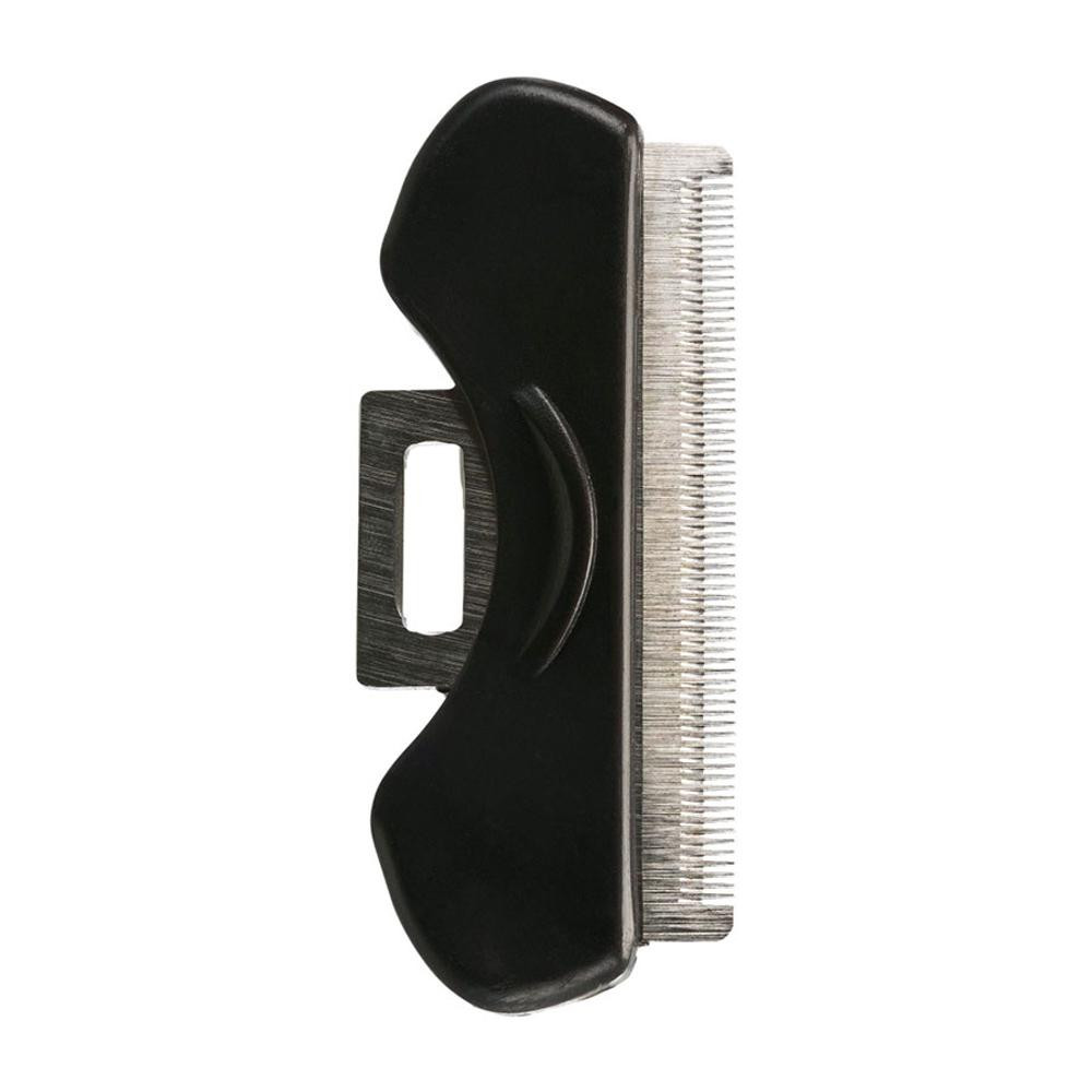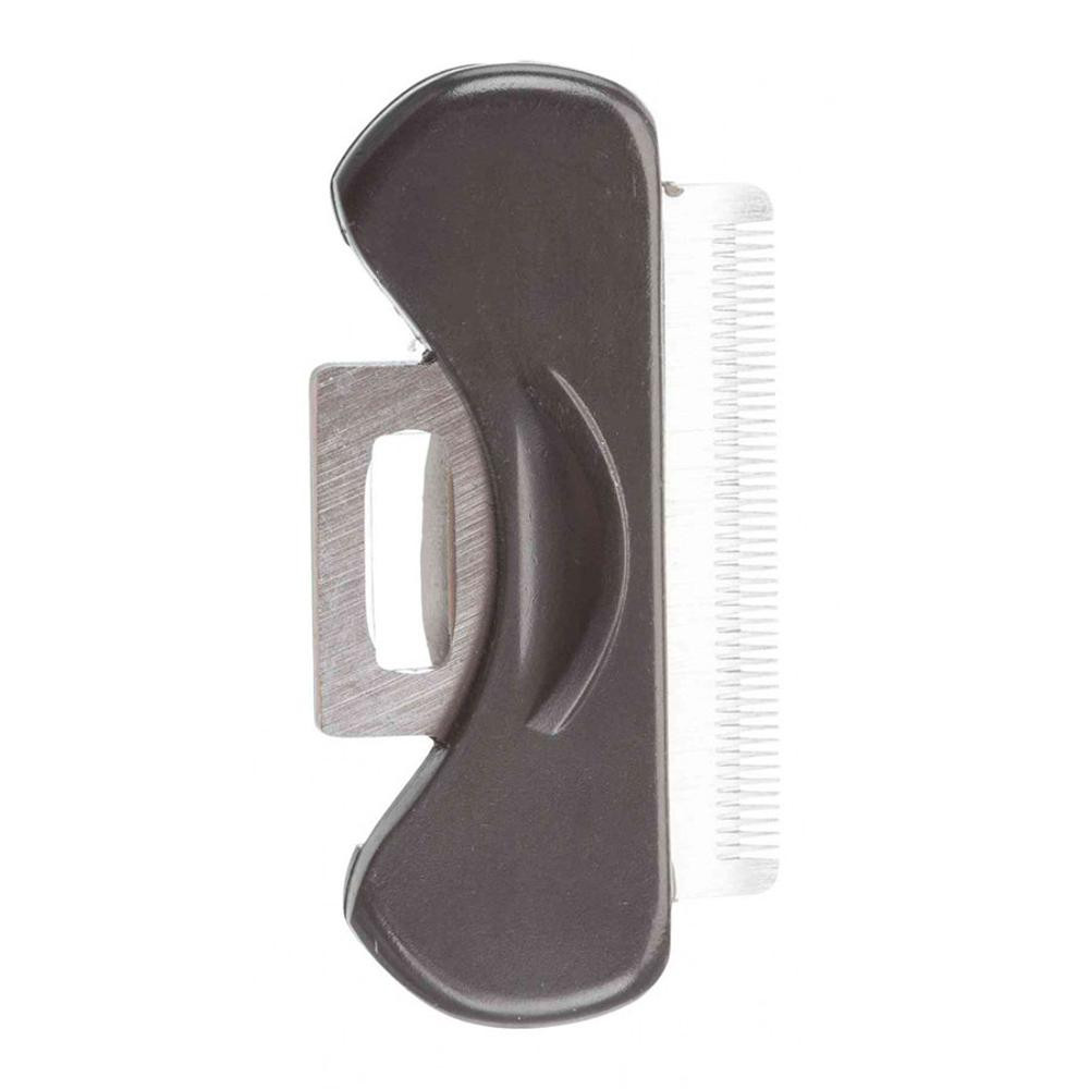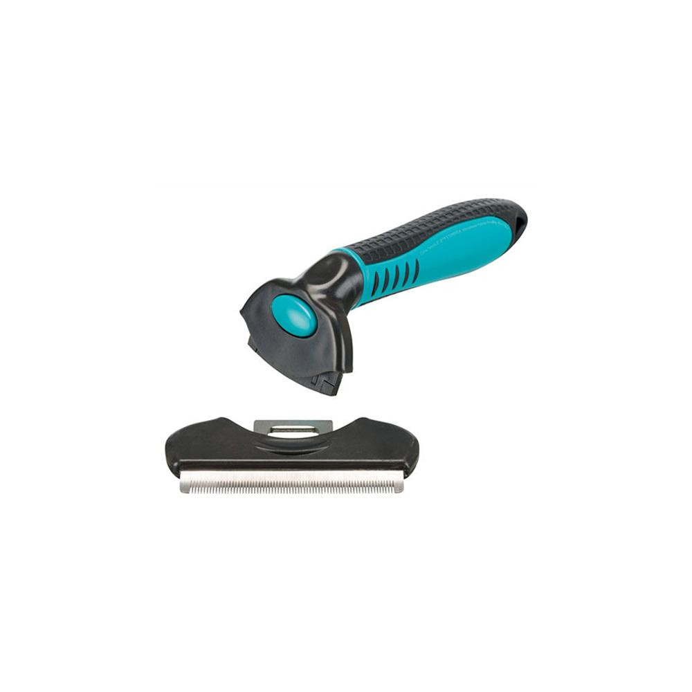 Praktikus fésű az aljszőrzet eltávolítására. Rozsdamentes acél pengével, műanyag nyéllel és csúszásmentes gumi markolattal.