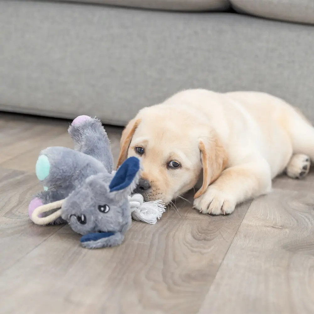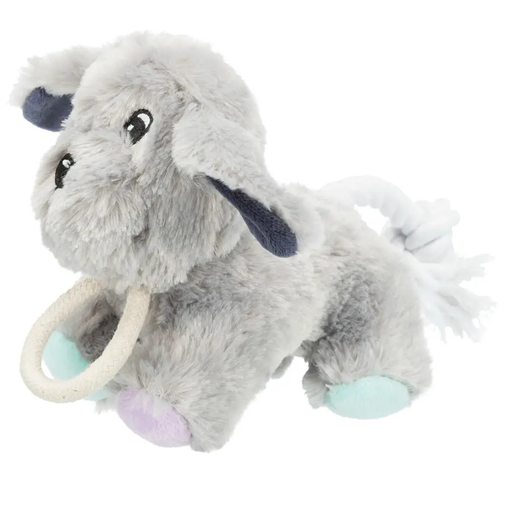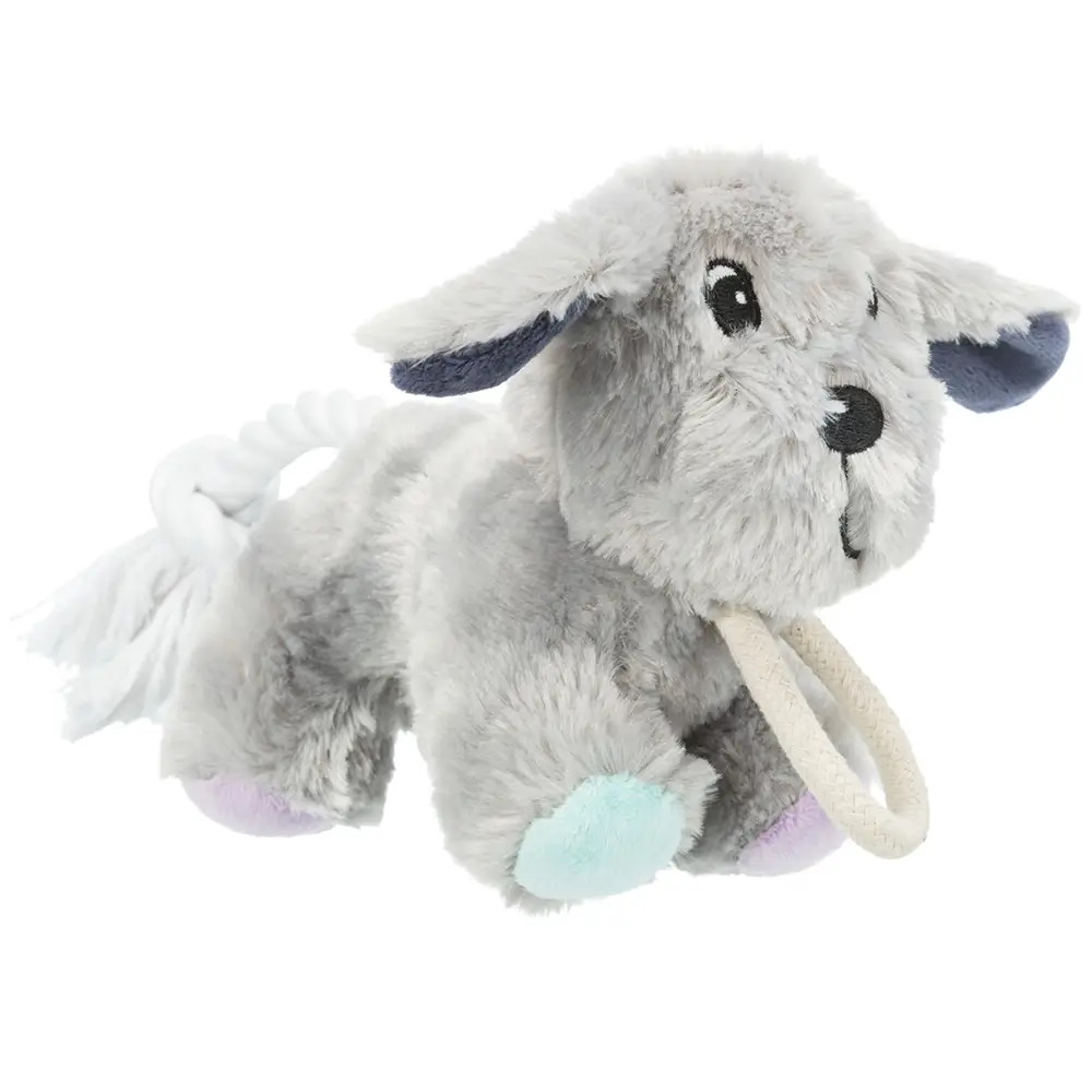 TRIXIE Junior Plüss kölyökkutya plüssből készült sípolós, kutya formájú játék kötél farokkal és fogóval kölyök kutyák részére