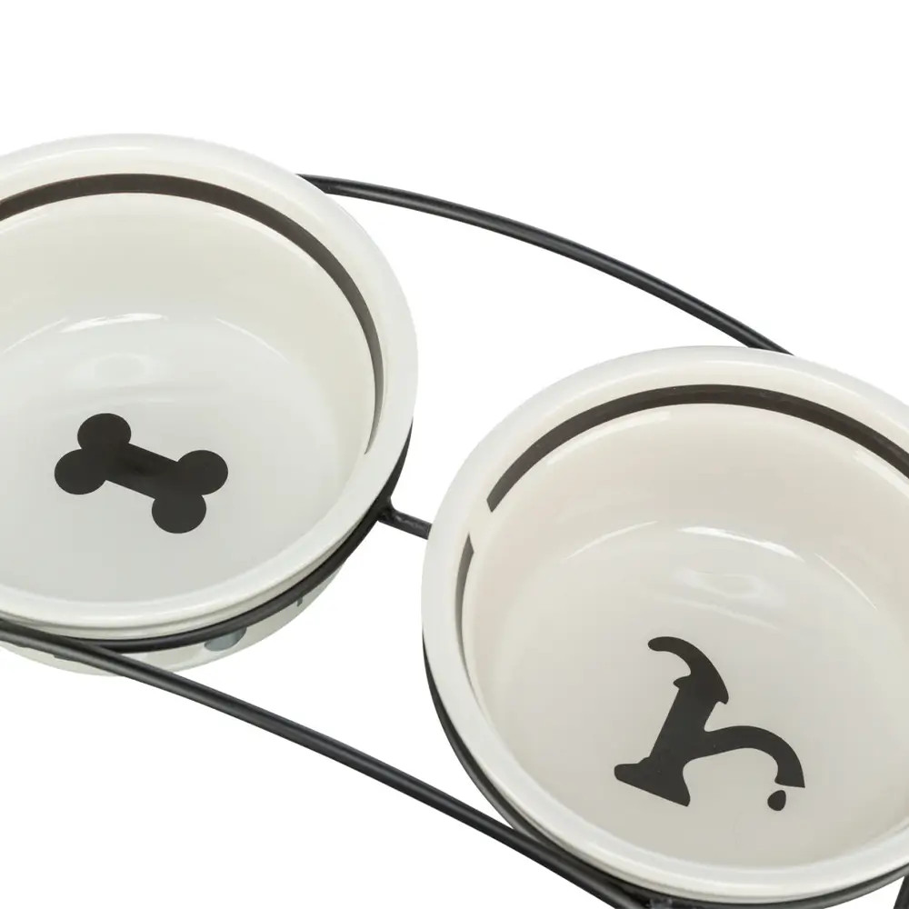 TRIXIE kerámia tál szett különböző méretekben, water és food felirattal a tál külső részén, valamint víz és eledel piktorgrammal a tálak belsejében.