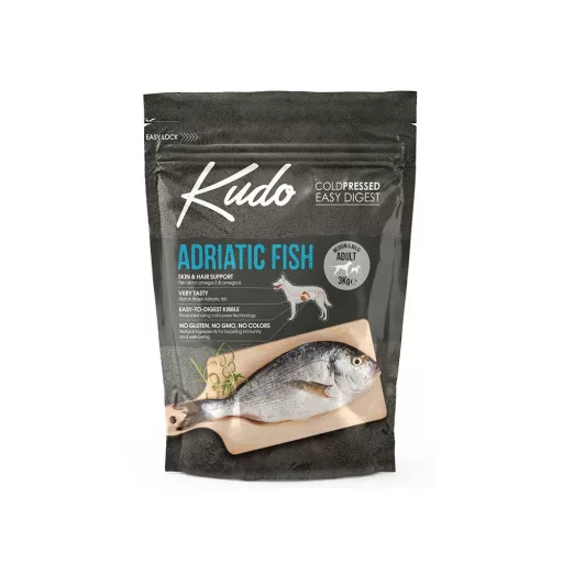 Kudo Adriatic Fish Medium-Maxi hidegen sajtolt, teljes értékű, hipoallergén száraz kutyatáp 1 éves vagy annál idősebb közepes és nagytestű kutyák számára tengeri halakból, zöldségekből, gyümölcsökből és gyógynövényekből.