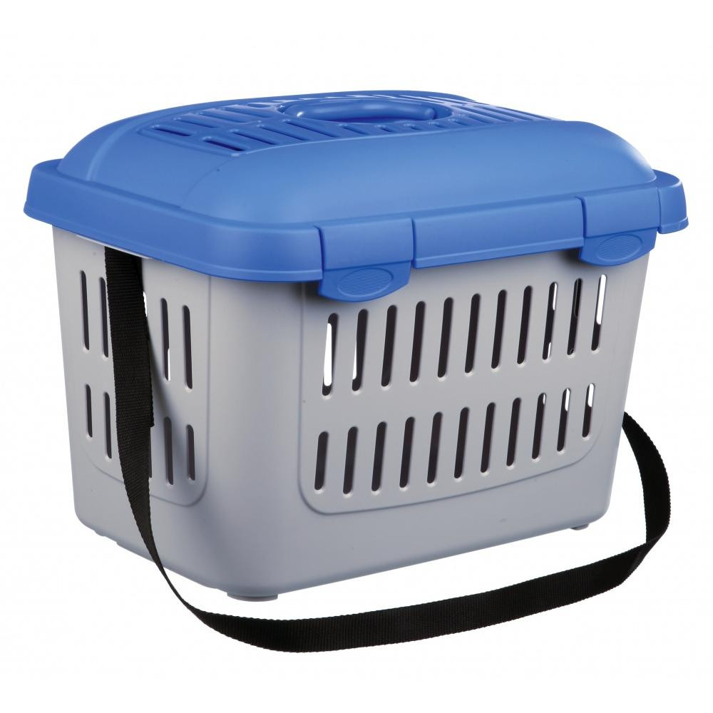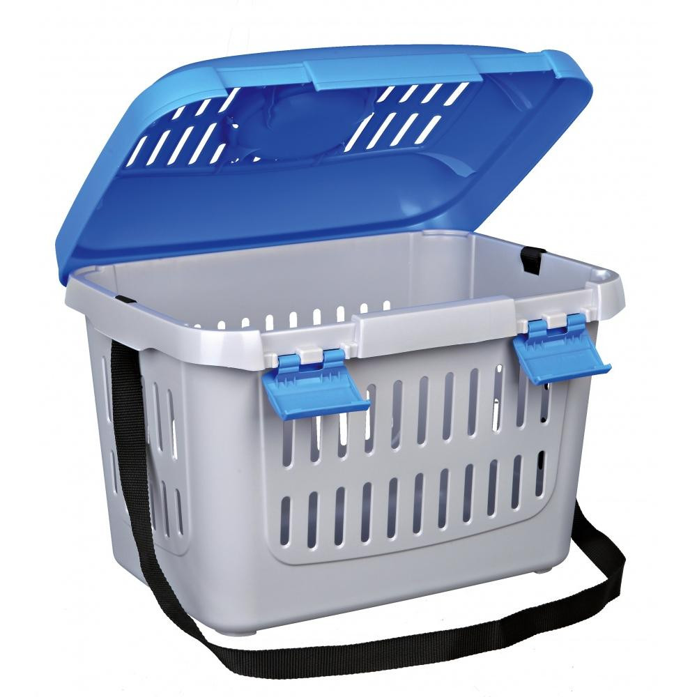 Műanyag, jól szellőző szállítóbox fogantyúval, vállpánttal és felfelé nyíló tetővel kisállatoknak, macskáknak és kistestű kutyáknak - max. 5 kg.