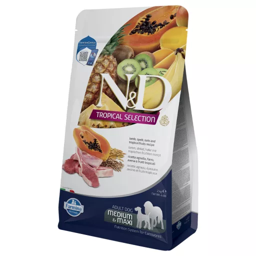 Az N&D Tropical Selection Bárány teljes értékű, hipoallergén kutyatáp trópusi gyümölcsökkel és ősi típusú gabonafélékkel felnőtt, közepes és nagytestű kutyák részére.
