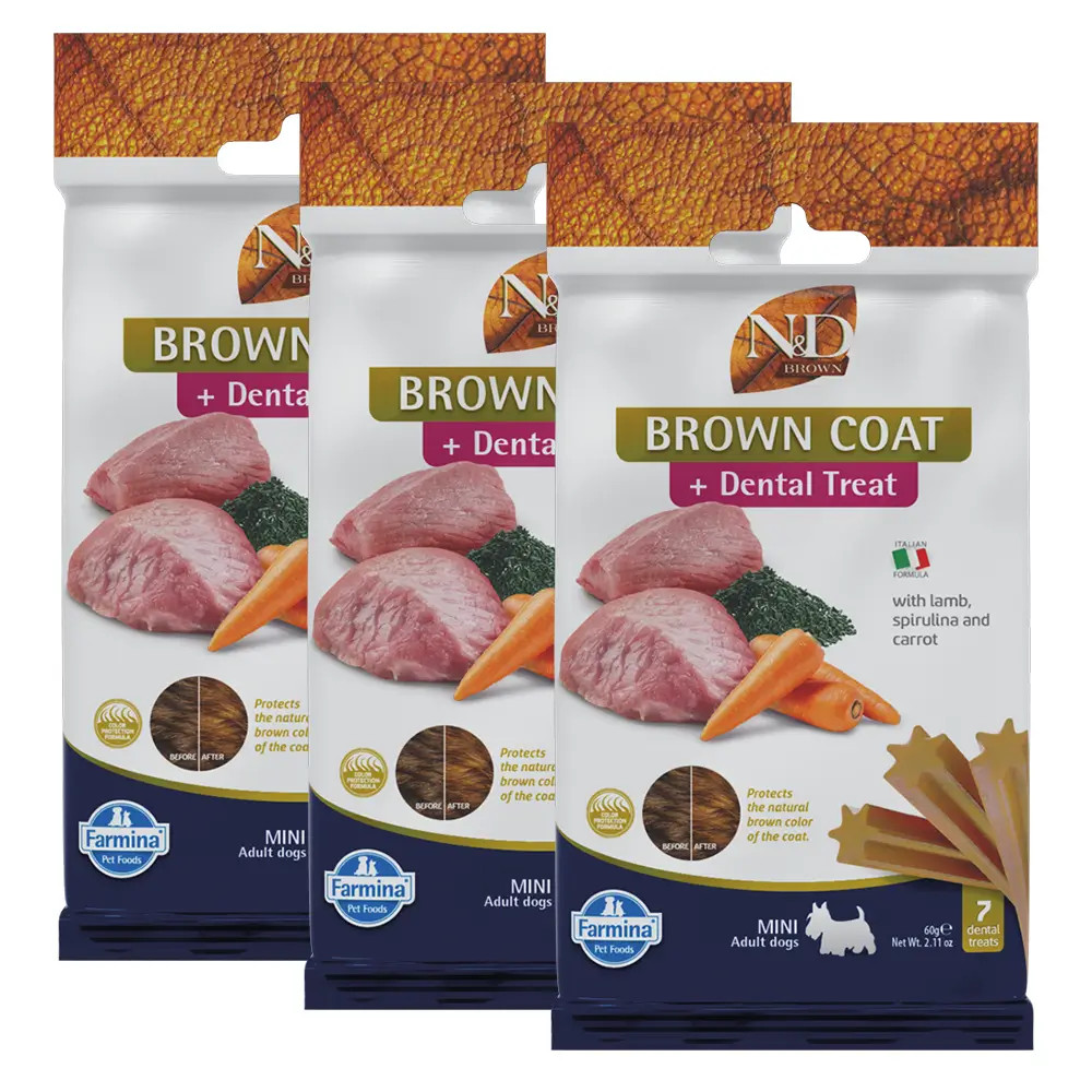 N&D Brown Dog Fogtisztító jutalomfalat báránnyal, spirulinával és sárgarépával kistestű kutyák számára 4 hónapos kortól - fogápolás Color Protection formulával barna szőrű kutyáknak, hogy fogaik éppúgy ragyogjanak, mint a bundájuk!