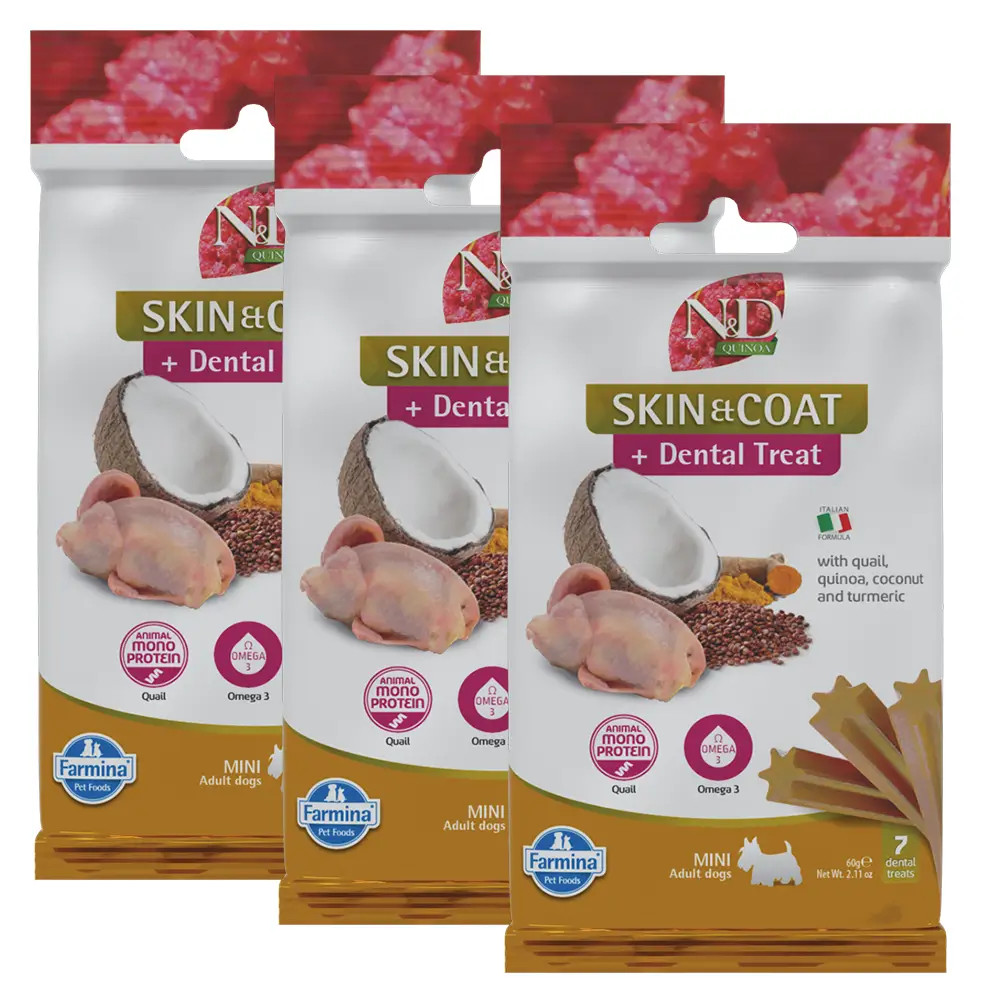 N&D Quinoa Skin&Coat Fogtisztító jutalomfalat fürjjel, quinoával, kókusszal és kurkumával kistestű kutyák számára 4 hónapos kortól.