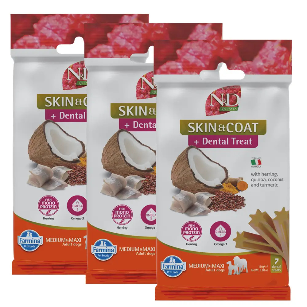 N&D Quinoa Skin&Coat Fogtisztító jutalomfalat heringgel, quinoával, kókusszal és kurkumával 10kg feletti kutyák számára 4 hónapos kortól.