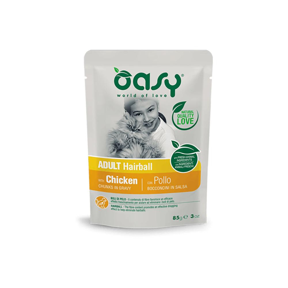 Az Oasy Chunks in Gravy Hairball puha falatok szószban csirkehússal szőrlabdaképzésre hajlamos felnőtt macskáknak.