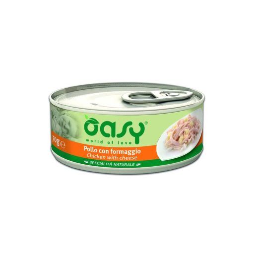 Az Oasy Natural Csirke és Sajt konzerv lágy zselében elkészített finom csirkefilé sajttal.