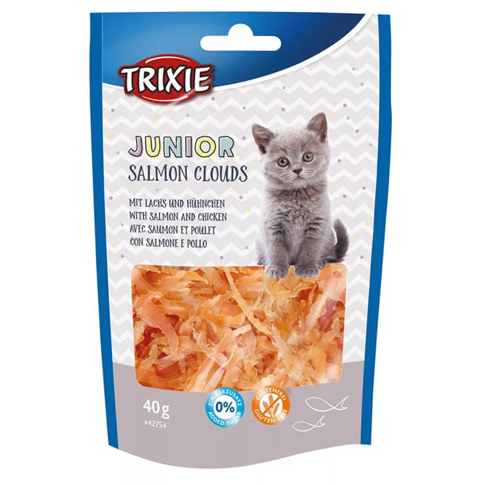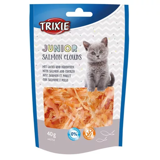 Trixie Lazacfelhők - lazachúsból készült ízletes jutalomfalat kölyökmacskáknak 55% lazac és 20% csirkehús tartalommal. Nem tartalmaz hozzáadott cukrot.