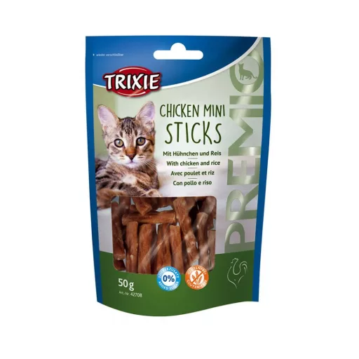 Trixie Premio Csirke Mini Sticks - ízletes, csirkés rizses jutalomfalat rudacskák macskáknak. Nem tartalmaz hozzáadott cukrot.