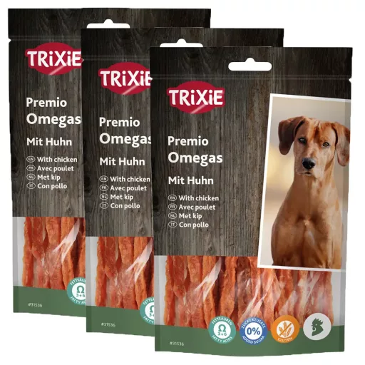 Trixie Premio Omega Stripes Csirkés - szárított csirkehúsból készült, omega-3 és omega-6 zsírsavakkal dúsított jutalomfalat kutyáknak. Nem tartalmaz hozzáadott cukrot.
