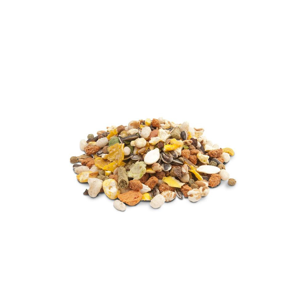 Összetevők: Gabonafélék (40%), magvak, növényi eredetű származékok, zöldségek, diófélék, gyümölcsök, növényi fehérjekivonatok, ásványi anyagok, olajok és zsírok, cukrok Analitikai alkotóelemek: 15% fehérje, zsírtartalom 9,5%, nyersrost 8%, nyers hamu 3,5%, kalcium 0,4%, foszfor 0,4% Táplálkozási adalékok/kg: A-vitamin 9700 NE, D3-vitamin 1550 NE, E-vitamin 39 mg, E1 (vas) 46 mg, 3b103 (jód) 1,5 mg, 3b405 (réz) 7 mg, 3b502 (mangán) 60 mg, 3b603 (cink) 55 mg, 3b801 (szelén) 0,1 mg Technológiai adalékok: antioxidánsok Érzékszervi adalékok: színezékek