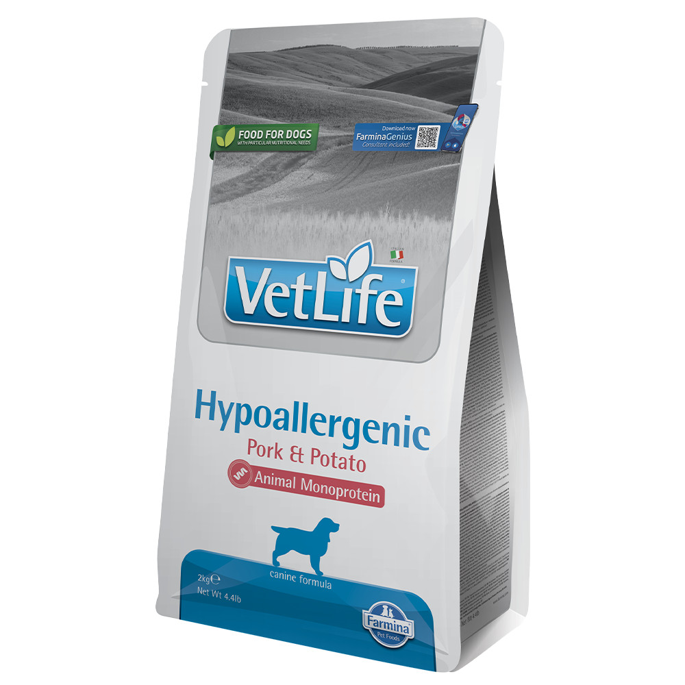 A Farmina Vet Life Hypoallergenic Sertés és burgonya teljes értékű diétás eledel táplálék allergiában szenvedő kutyák részére. Különösen ajánlott bőrfunkció erősítésére dermatózis és erős szőrhullás esetén.